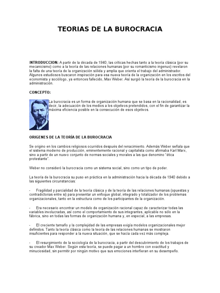 Dichos organismos actúan bajo un régimen de. Este artículo explica la teoría de la burocracia de los principios de administración por max weber en una forma práctica. Para weber la burocracia tiene una connotación positiva en que es un sistema más racional que las alternativas anteriores sistemas de. Sus obras más importantes se basaron en la sociología de la religión y el gobierno pero también escribió acerca de la economía.